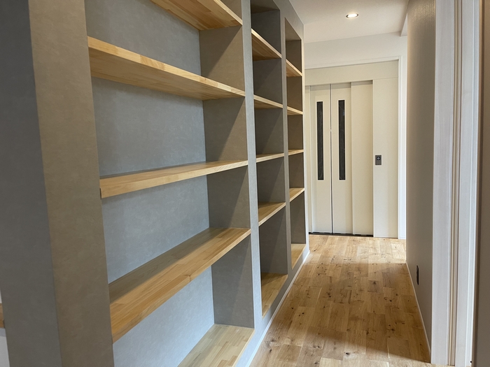 廊下の一面に設けた本棚は