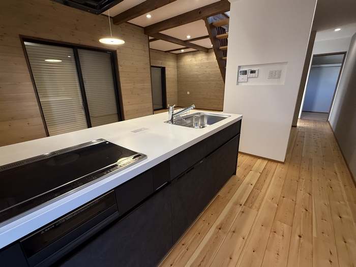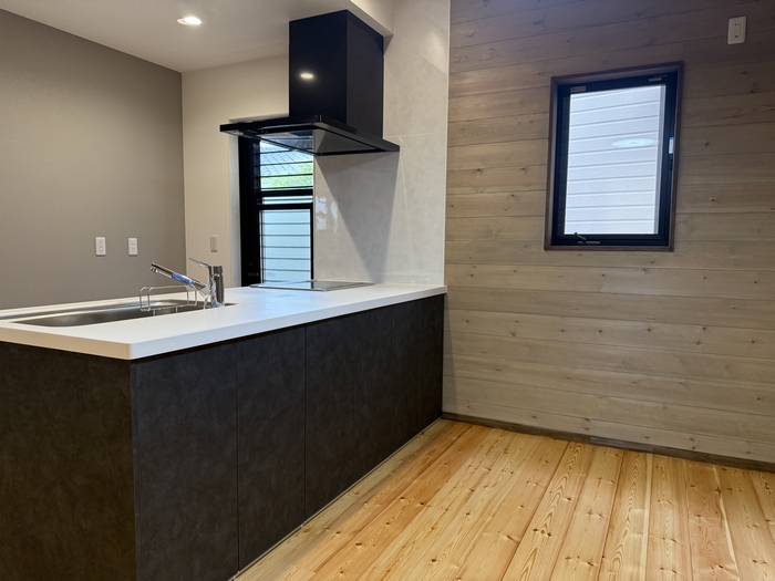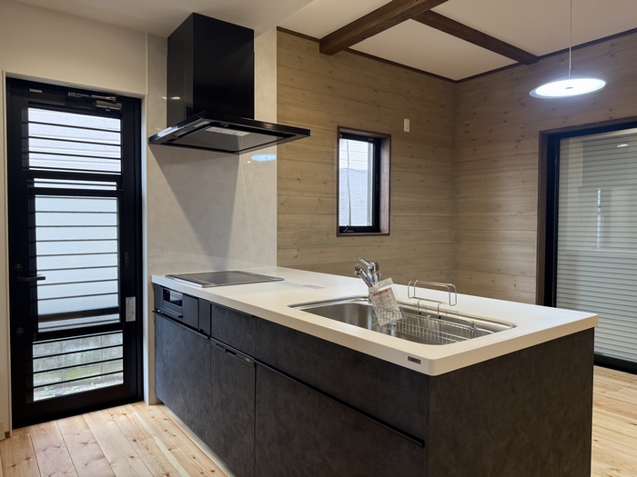 奥には黒を基調としたキッチンを配置し